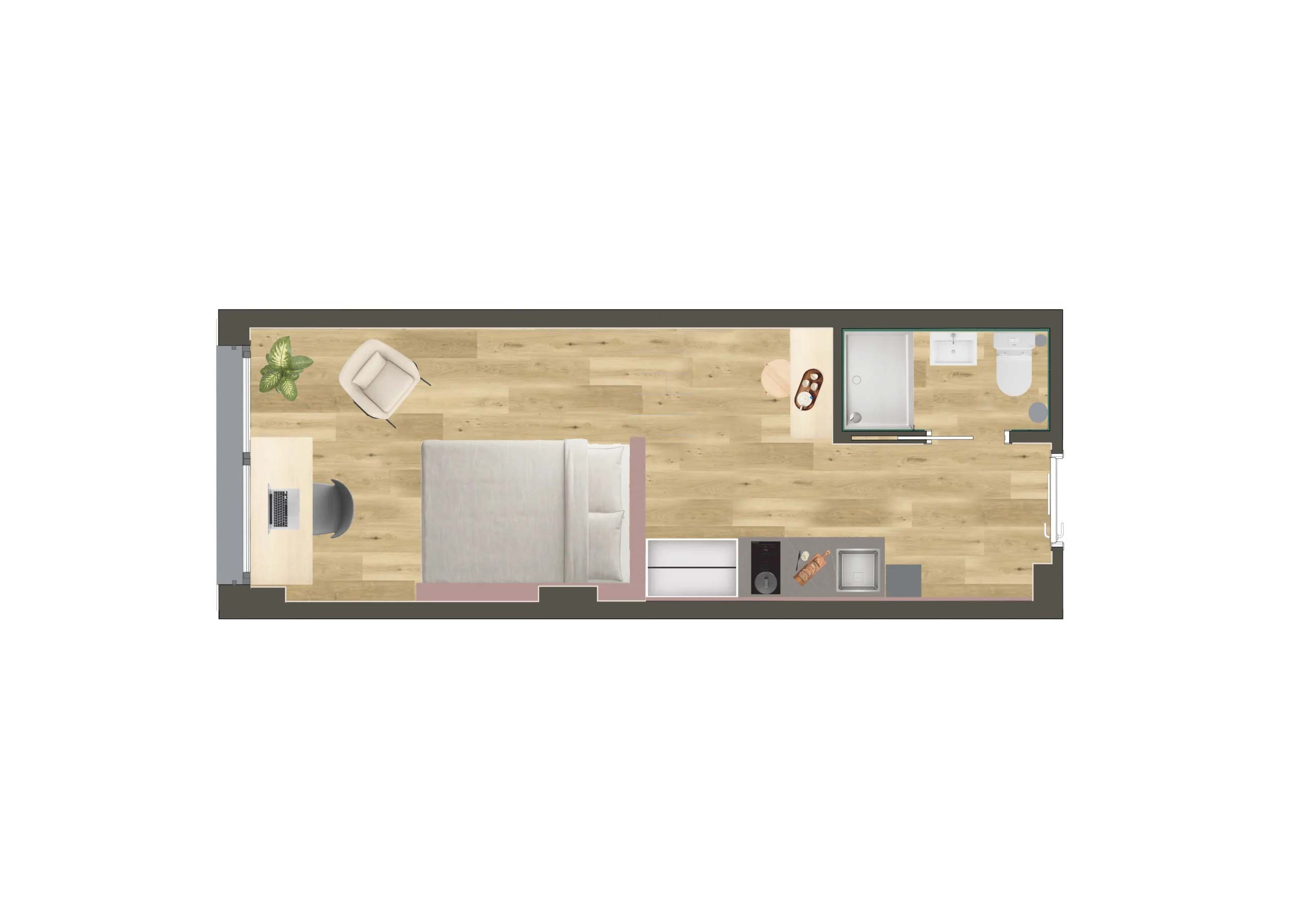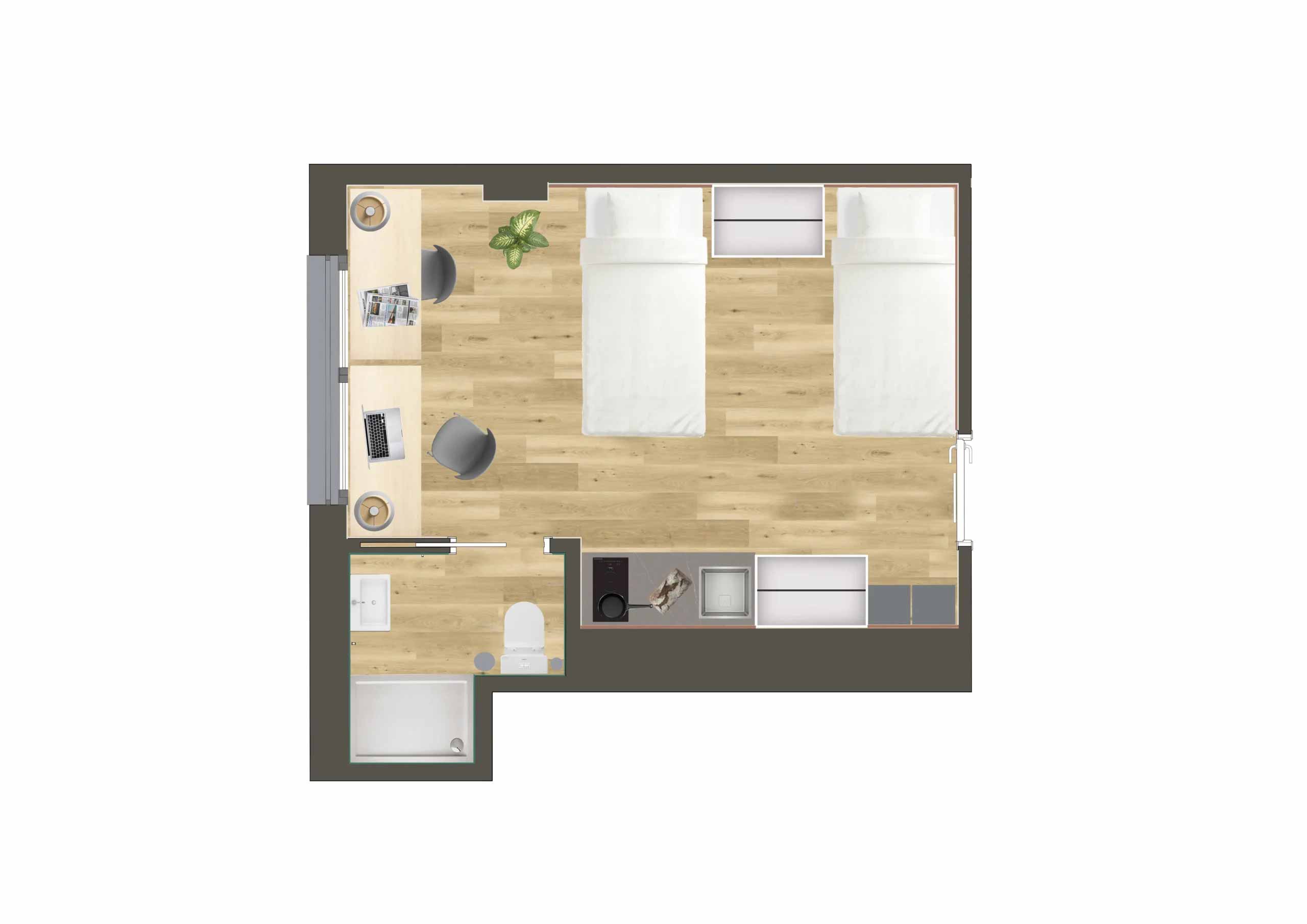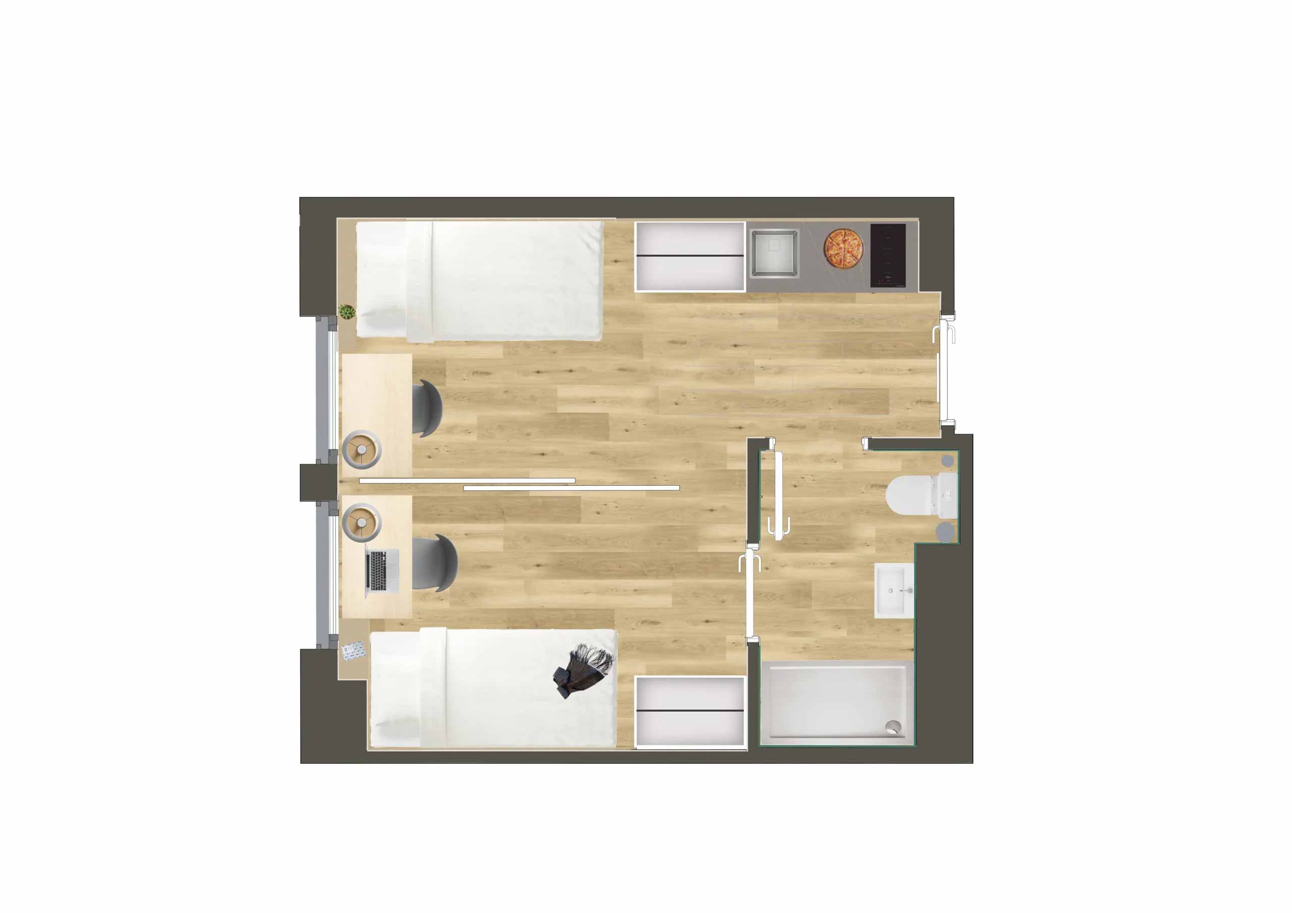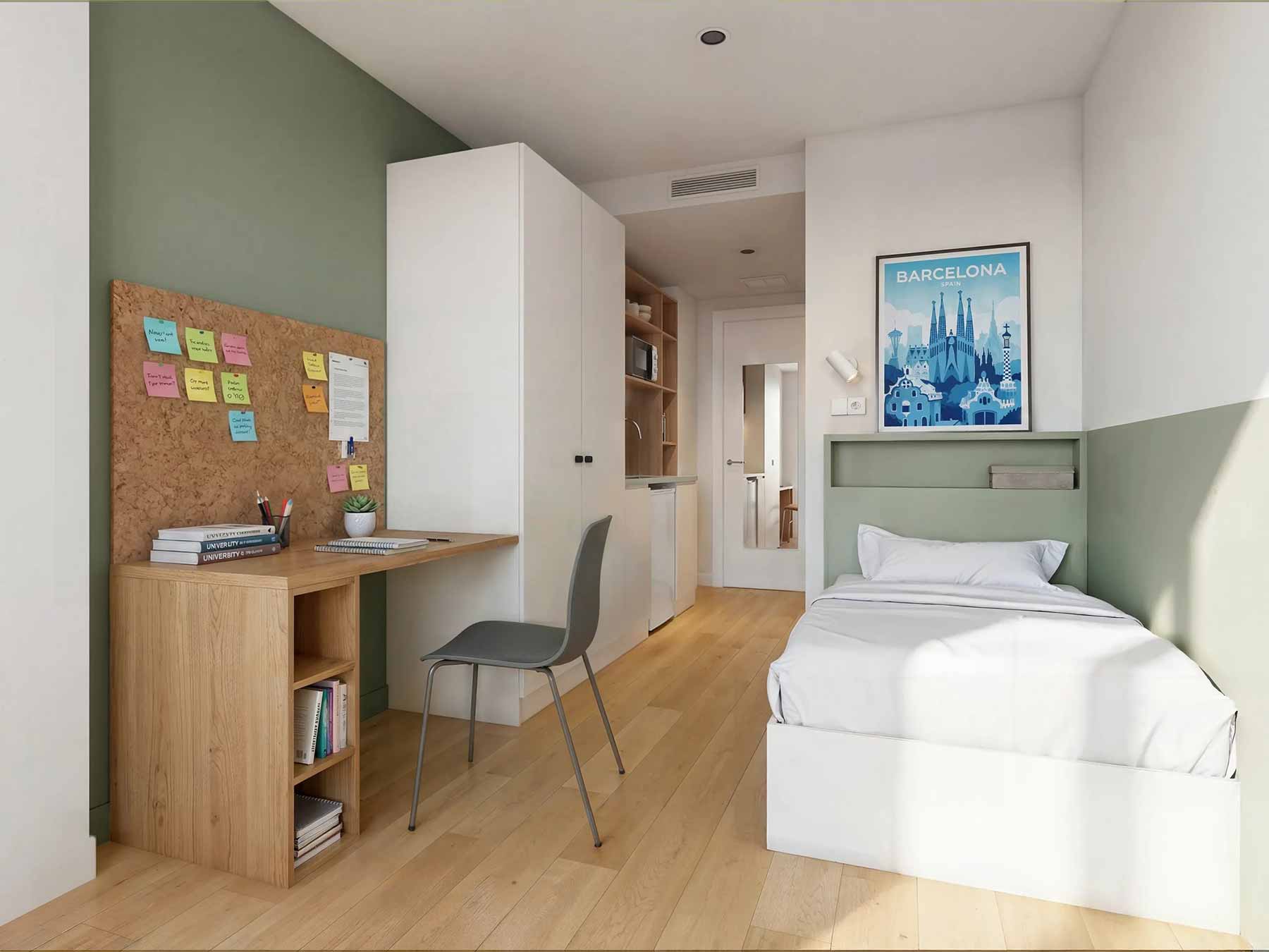 Camplus Poble Nou ofrece la gama más amplia de tipologías de alojamiento. Desde habitaciones individuales compactas hasta estudios dobles con terraza privada, todas las opciones comparten un denominador común: