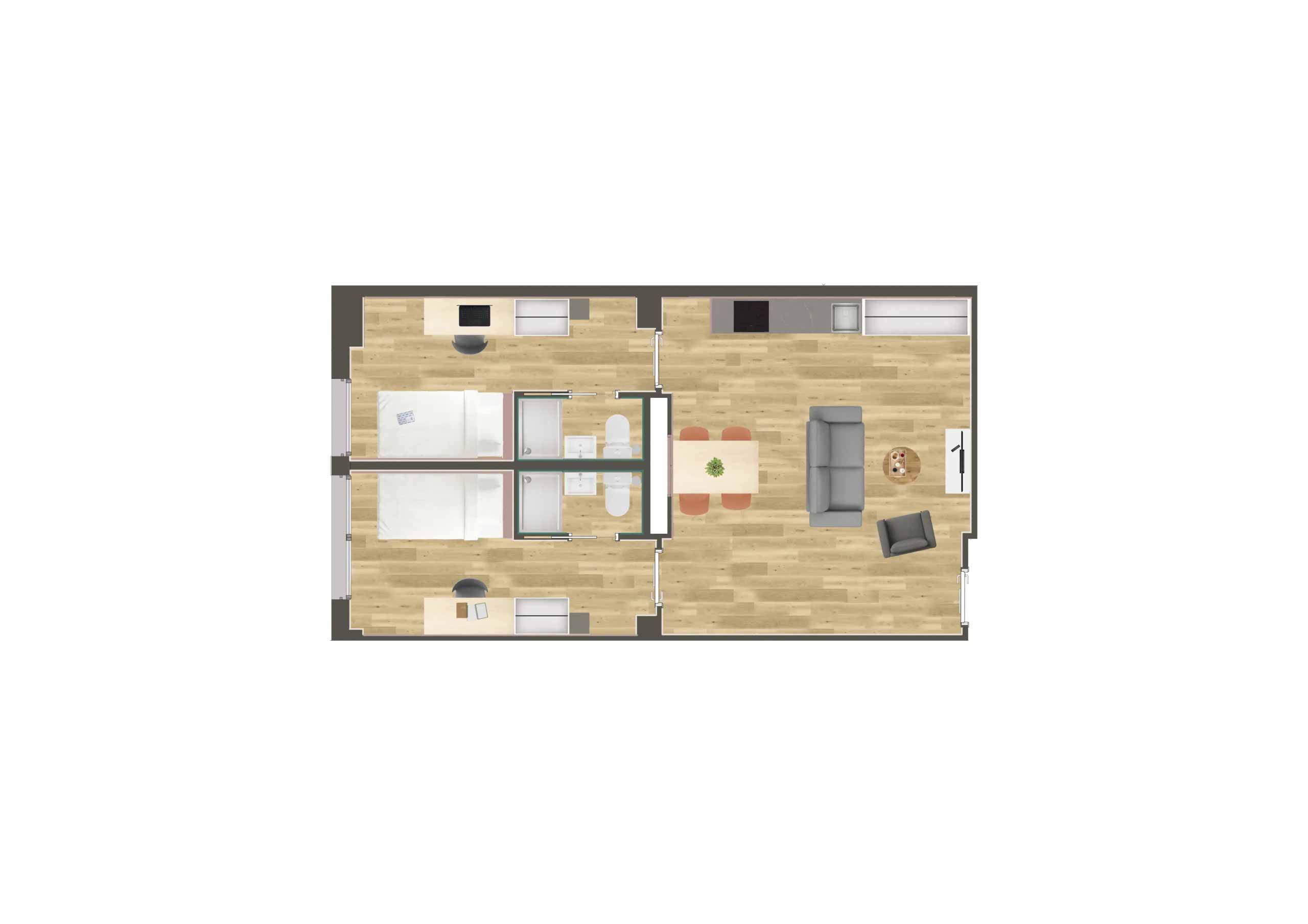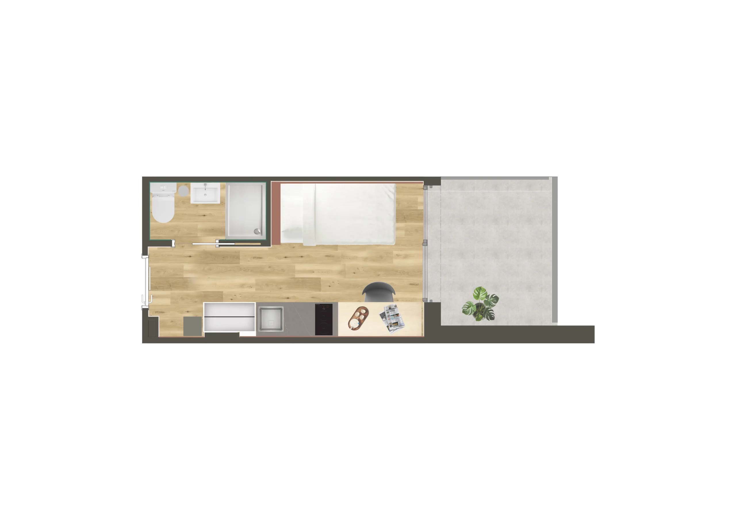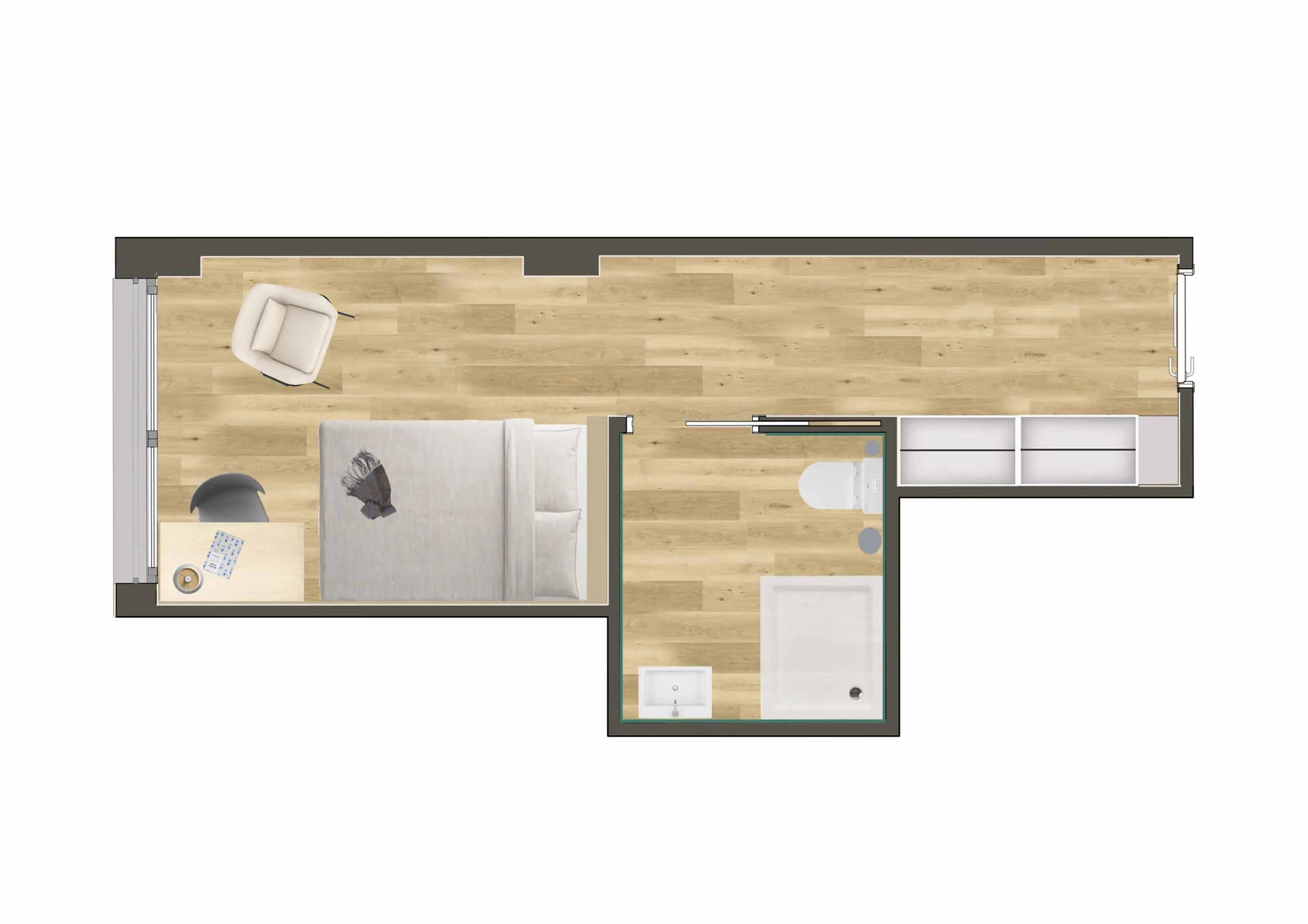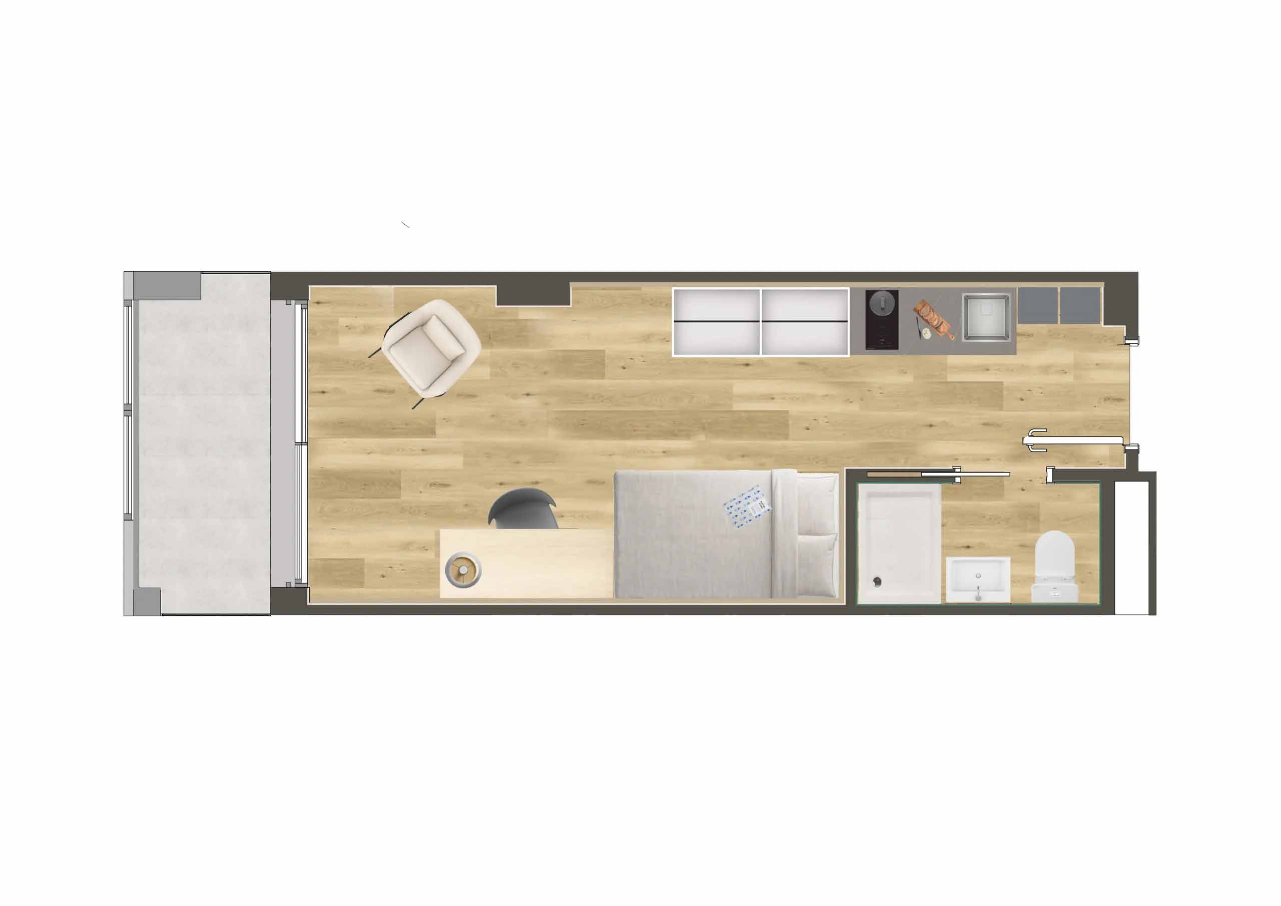 Camplus Poble Nou ofrece la gama más amplia de tipologías de alojamiento. Desde habitaciones individuales compactas hasta estudios dobles con terraza privada, todas las opciones comparten un denominador común: