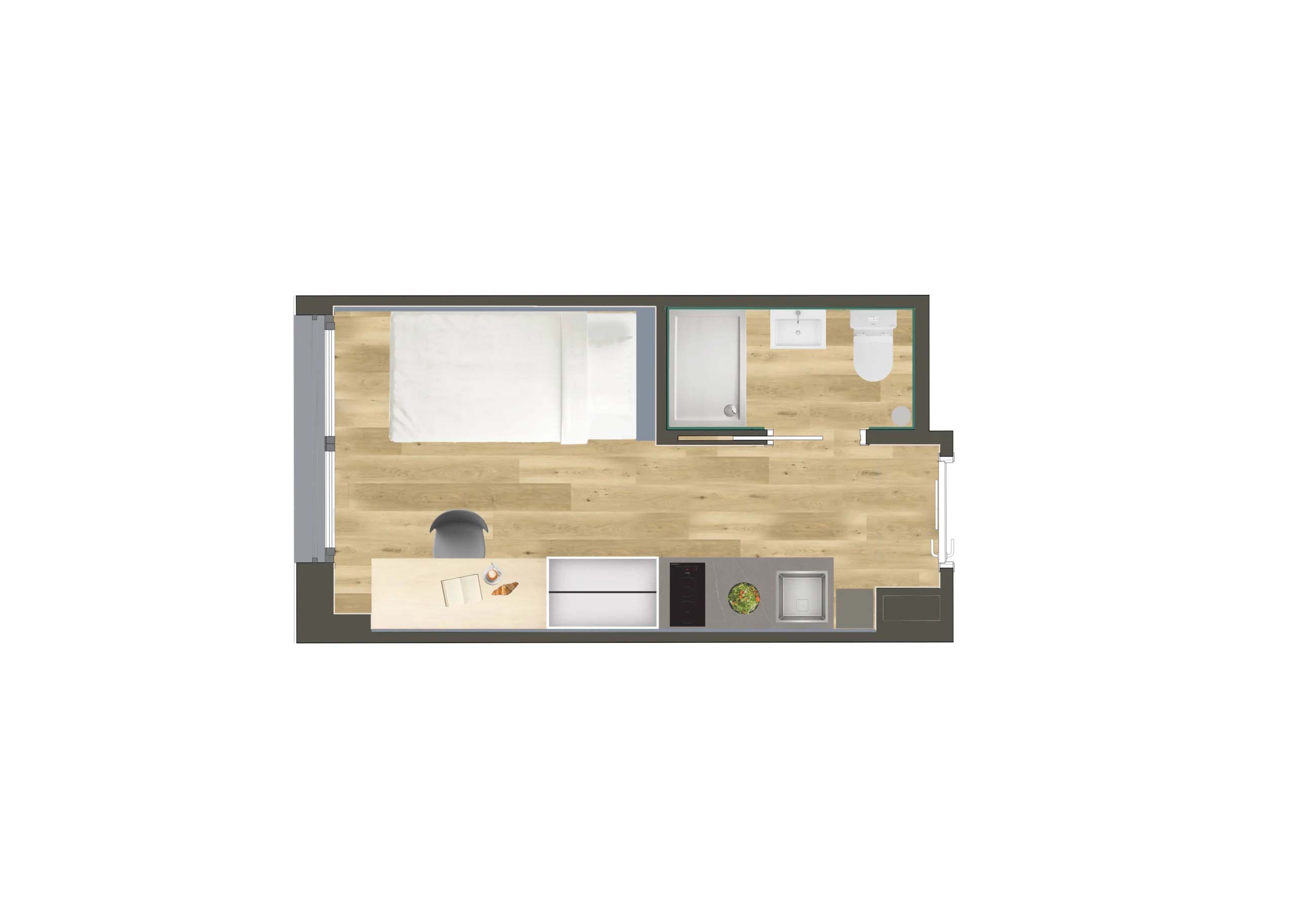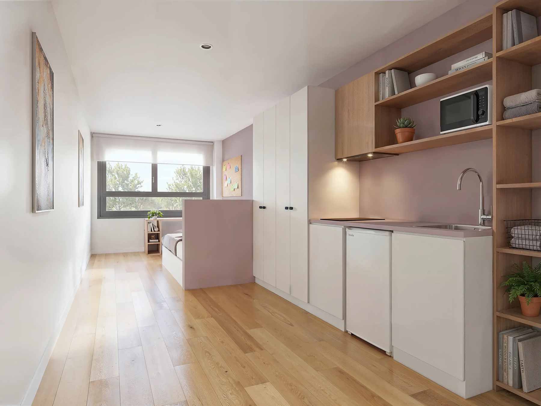 Las habitaciones incluyen kitchenette (microondas, nevera y fregadero) pero no placa de cocina. Los estudios cuentan con cocina completa, incluida placa de inducción, para mayor autonomía e independencia en la preparación de comidas. Ambas tipologías tienen baño privado completo y todos los demás servicios incluidos.