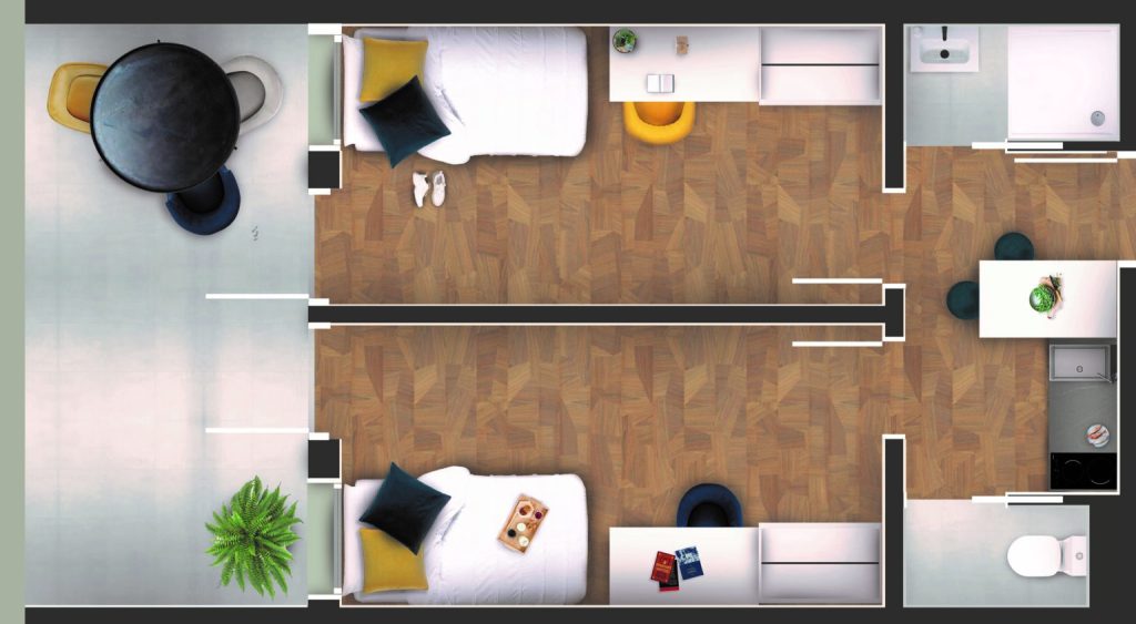 - Apartamento de Dos Habitaciones: Tu habitación individual y privada, con baño y kitchenette compartidos con otro estudiante. Independencia con compañía.