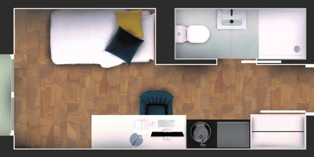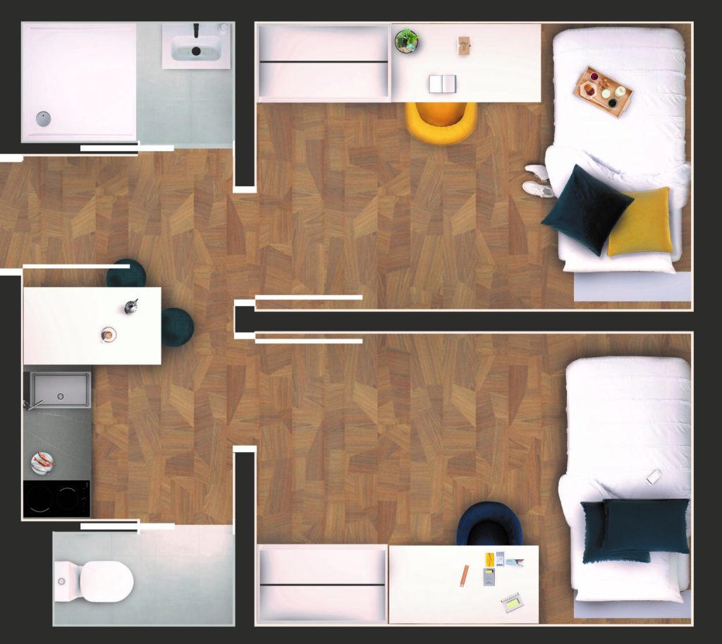 Todas las habitaciones de Camplus Sevilla están completamente amuebladas, son amplias, modernas y disponen de baño privado completo. Los detalles marcan la diferencia: camas con colchón viscoelástico de alta calidad, arcón para almacenaje extra, escritorio con flexo, silla ergonómica, armarios espaciosos, pinboard decorativo para colgar tus fotos y horarios, y kitchenette equipada con microondas, nevera, fregadero, menaje, cubertería y vajilla. Todo ello con aire acondicionado y calefacción individuales.