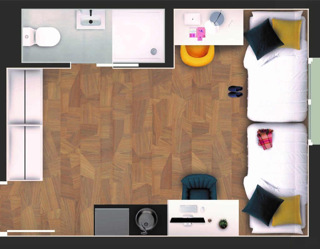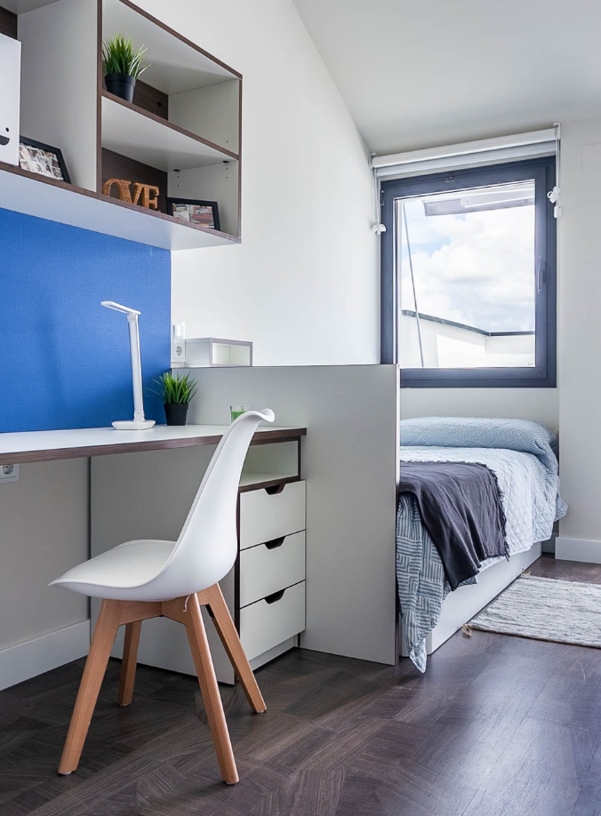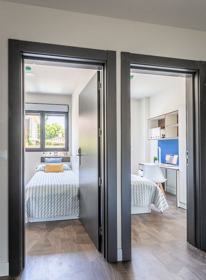 - Habitación Doble: Comparte tu experiencia universitaria con un amigo o conoce a uno nuevo. Habitación espaciosa, luminosa y con todo el equipamiento necesario para dos.
