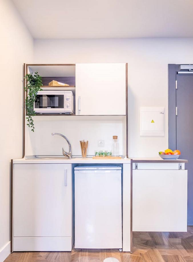 - Habitación Individual Superior con Cocina: Toda la independencia de la individual más una cocina completa para ti. Perfecta para quienes quieren total autonomía en su día a día.