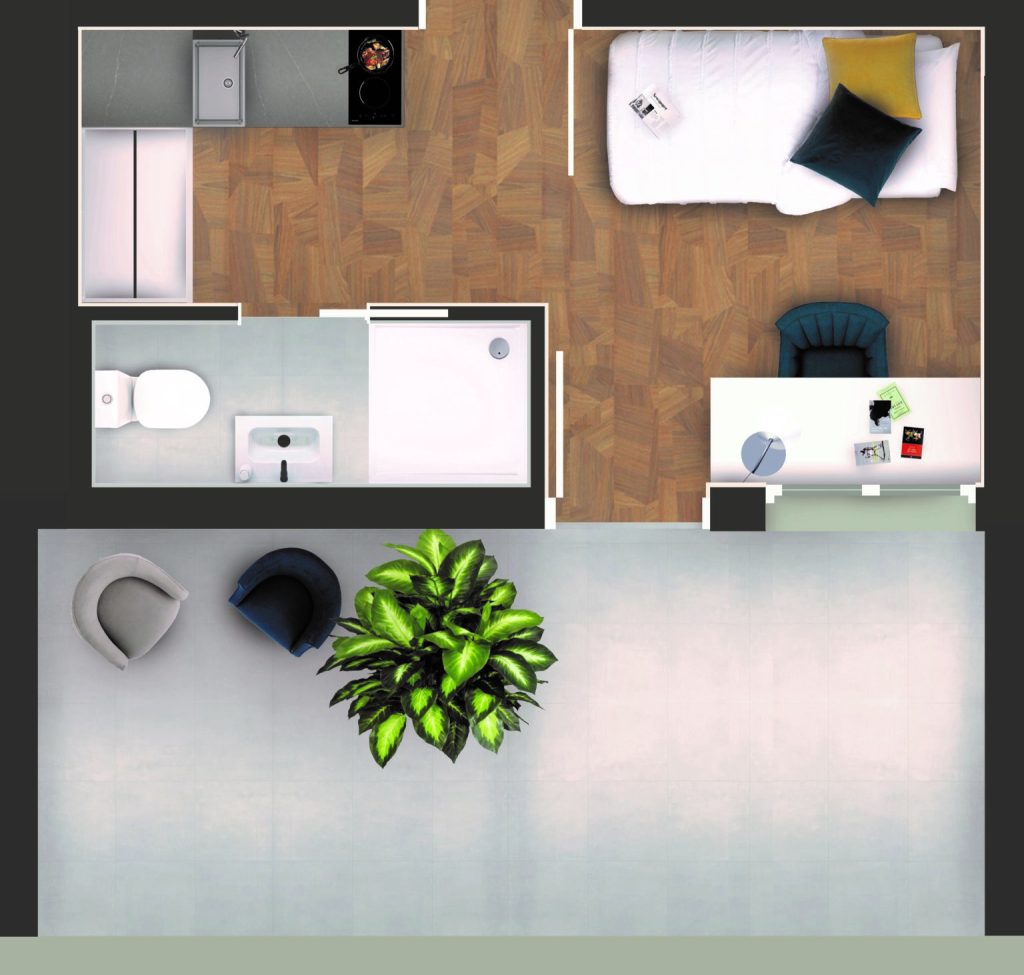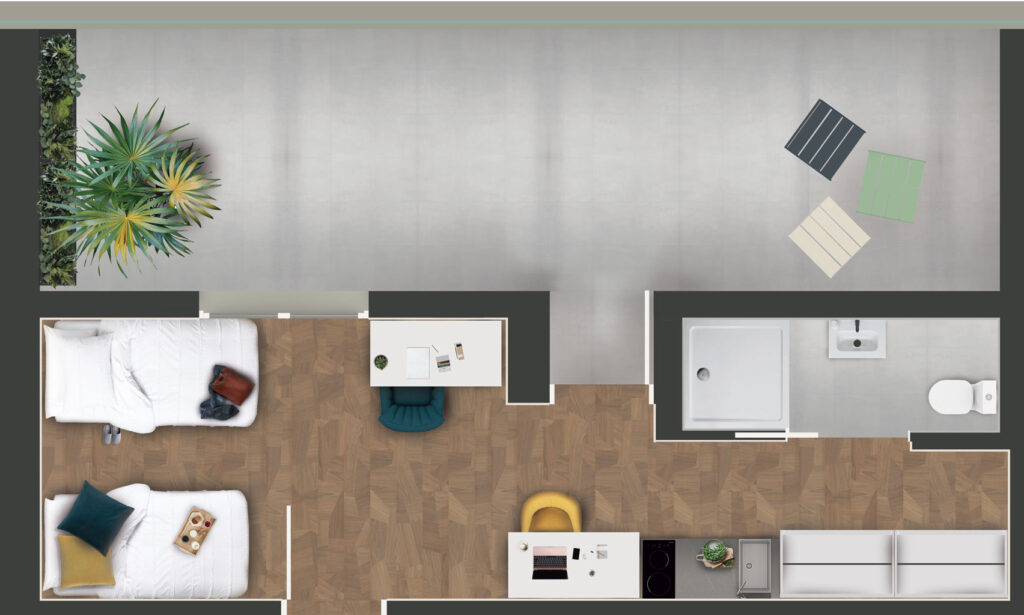 - Habitación Individual Premium con Terraza y Cocina: La opción más exclusiva: habitación individual con baño privado, cocina propia y terraza exterior. Diseño, confort y privacidad al máximo nivel.