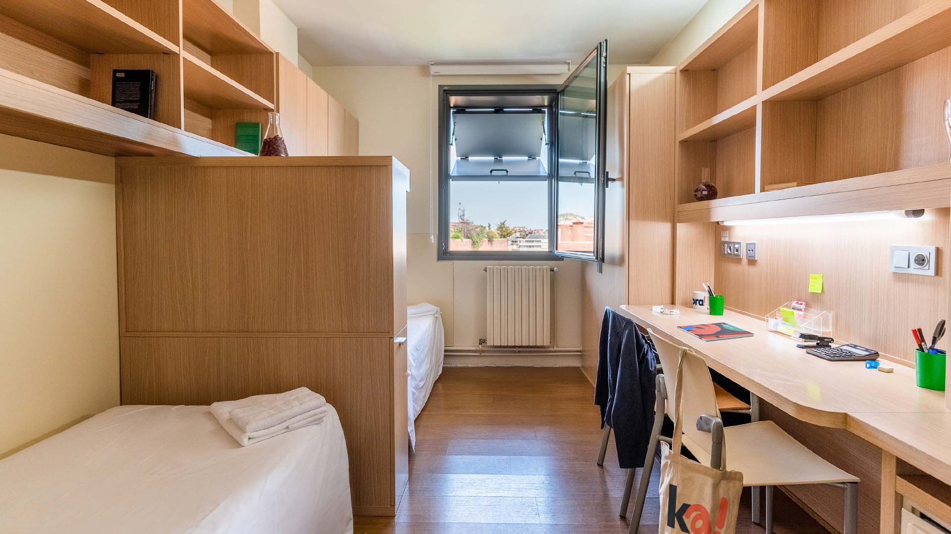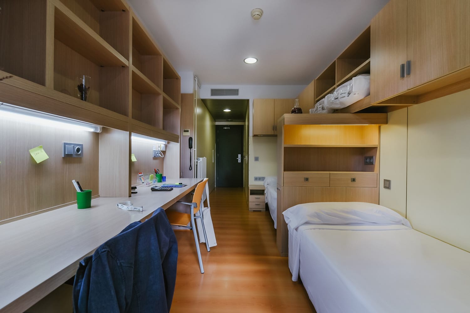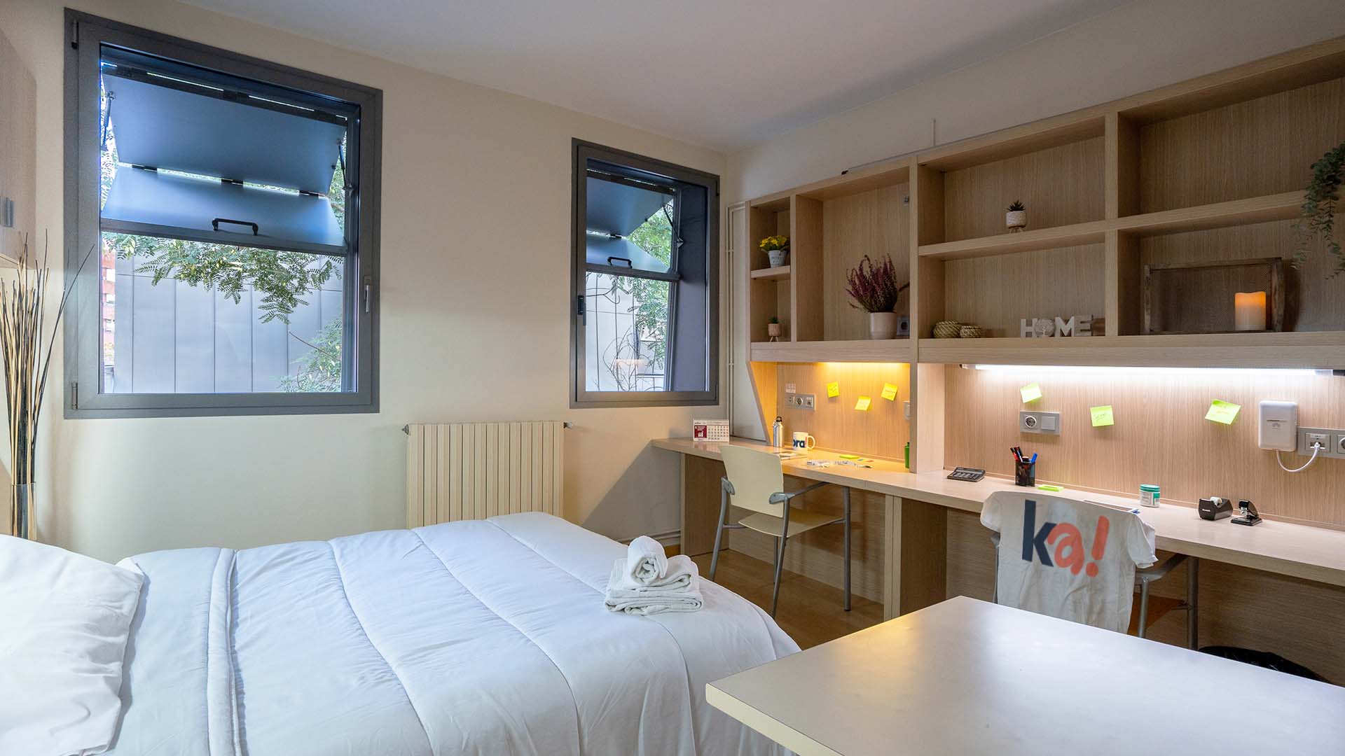 La opción más asequible de Kadora Sarriá. Un estudio compartido para dos residentes con cocina completa, baño privado y grandes dimensiones. Incluso puedes venir con tu mejor amigo. Descuento especial de hasta 350 € para estancias de semestre 25/26.