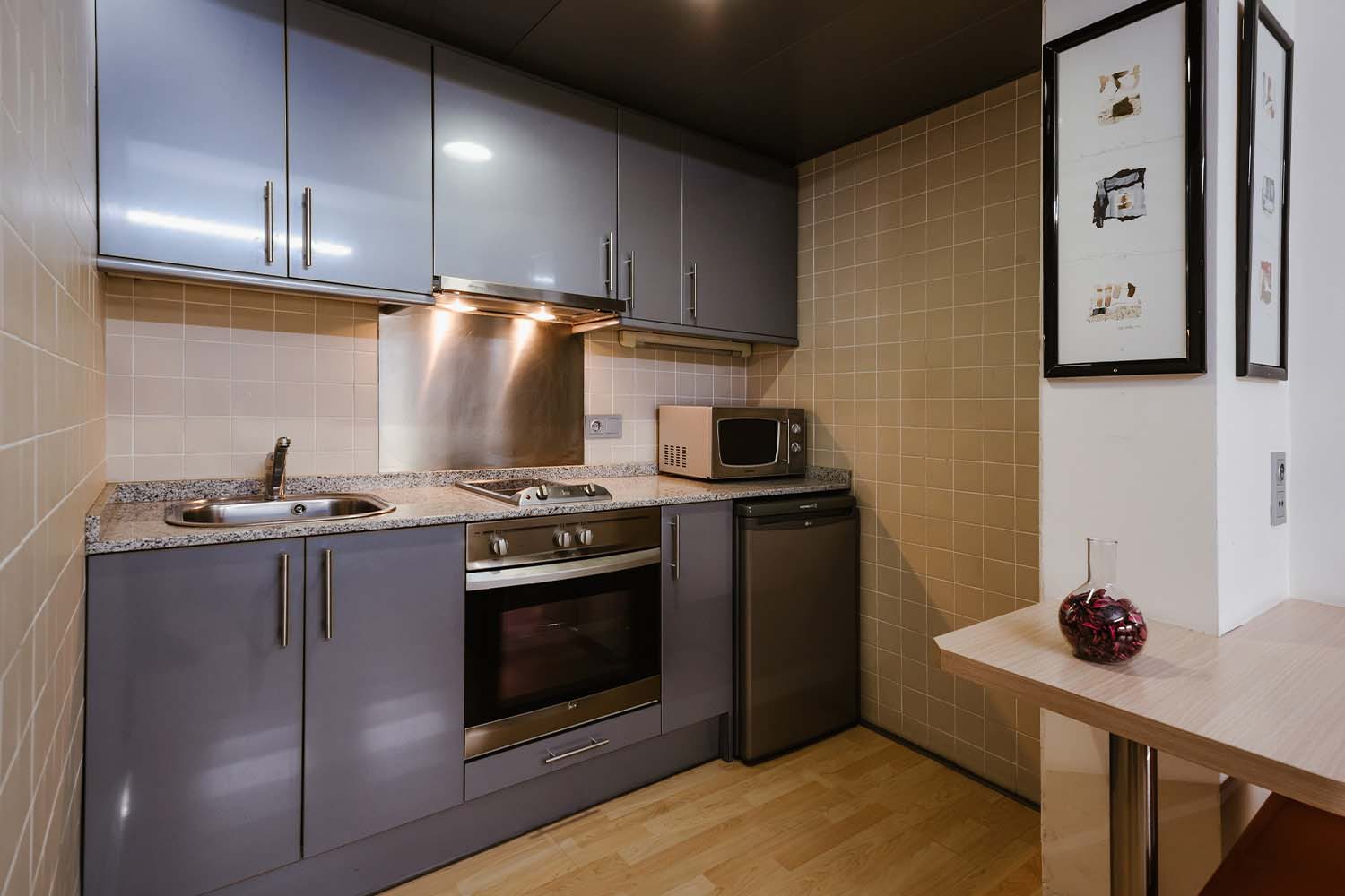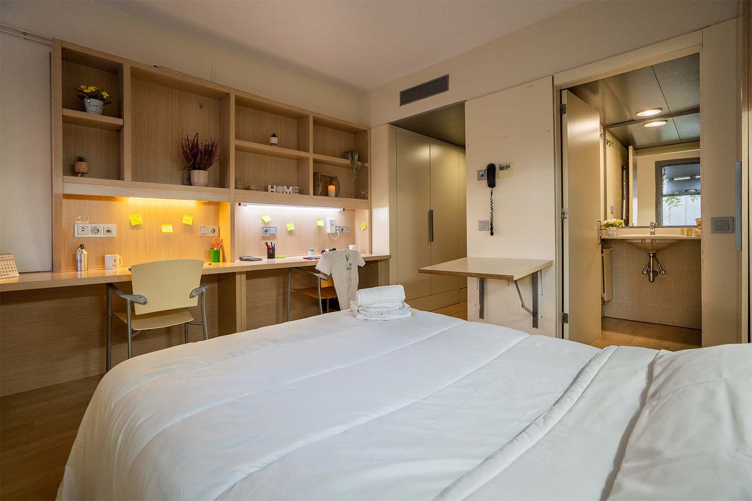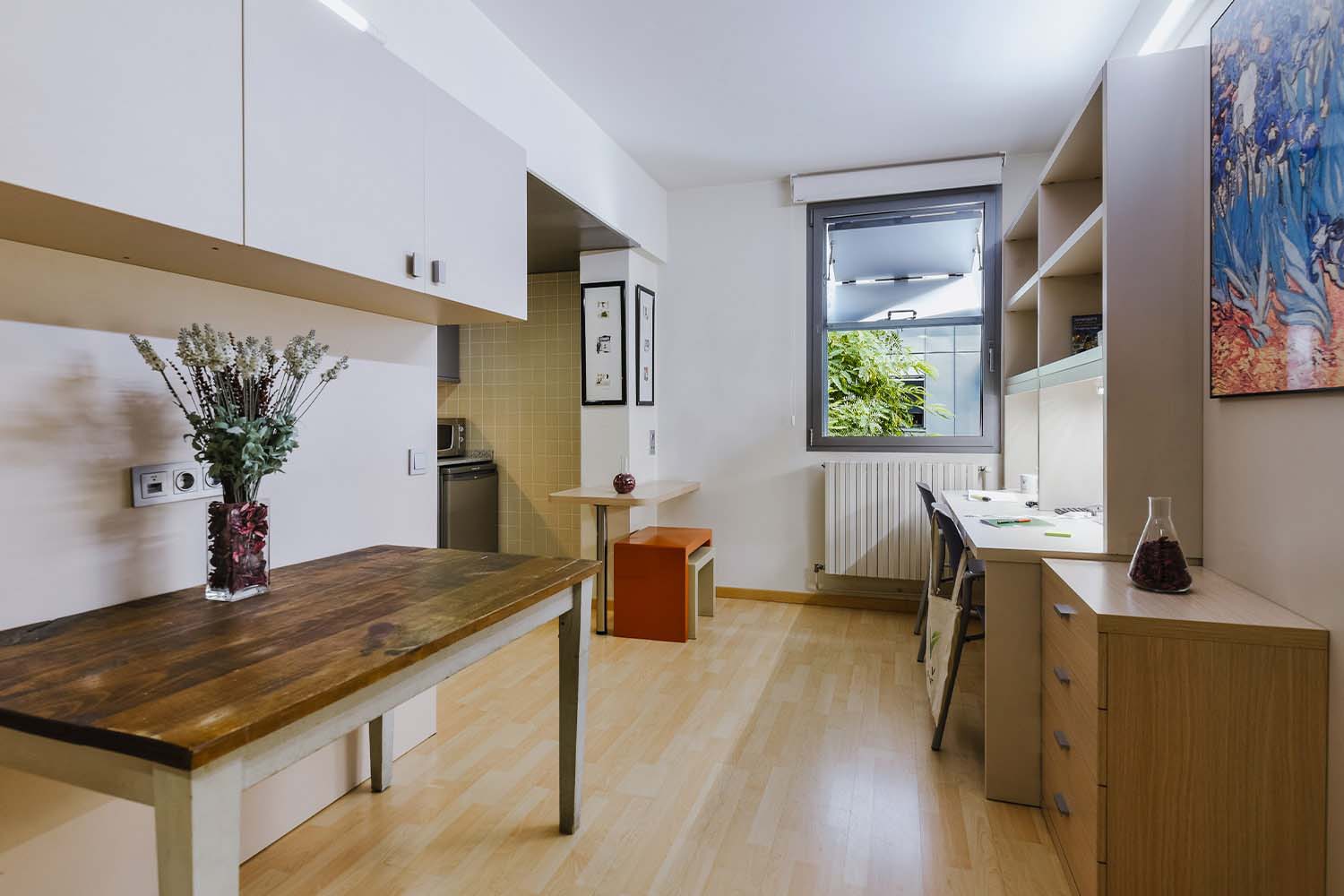 El nivel superior en confort y amplitud. Dos ambientes diferenciados —salón con cocina propia y habitación en-suite— para quienes buscan la experiencia más completa dentro de una residencia universitaria en Barcelona.