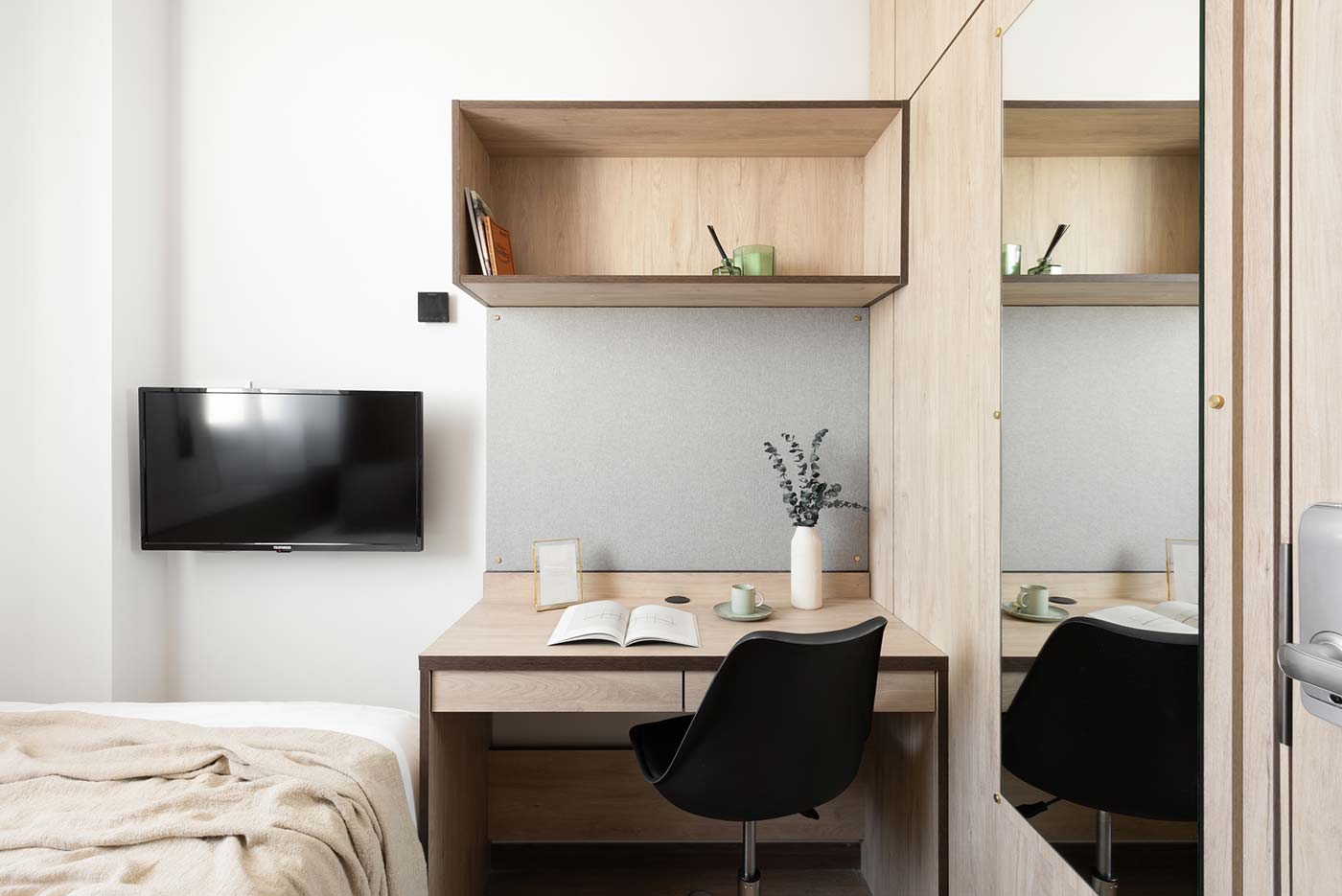 El alojamiento incluye diferentes modalidades: estudios privados (Studio) y habitaciones en apartamentos compartidos para dos personas (2Dio). Todas las habitaciones están completamente amuebladas y equipadas con Smart TV, zonas de estudio, climatización, cocina (completa o compartida según tipología) y baño privado. Algunas unidades también cuentan con terraza.